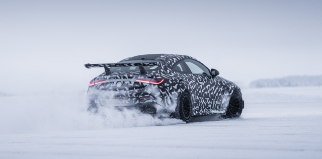 Trotz dichter Tarnfolie und der düsteren Winterkulisse lässt sich erahnen, was hier mit hohem Tempo durch den Schnee jagt: ein besonders radikales Performance-Fahrzeug aus dem Hause Mercedes-AMG. Das bislang noch nicht offiziell angekündigte Modell, das auf der CLE-Baureihe basiert, befindet sich nahe des Polarkreises in einem intensiven Erprobungsprogramm und gibt dabei bereits einen Vorgeschmack auf seinen kompromisslosen Charakter und ein markant-expressives Design.
